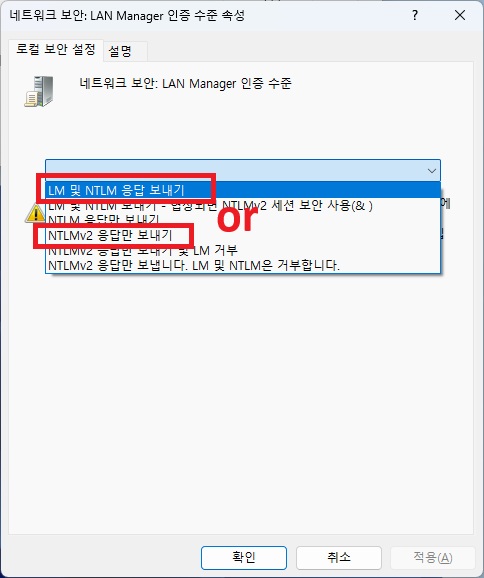 → "LM 및 NTLM 응답 보내기 " 으로 변경