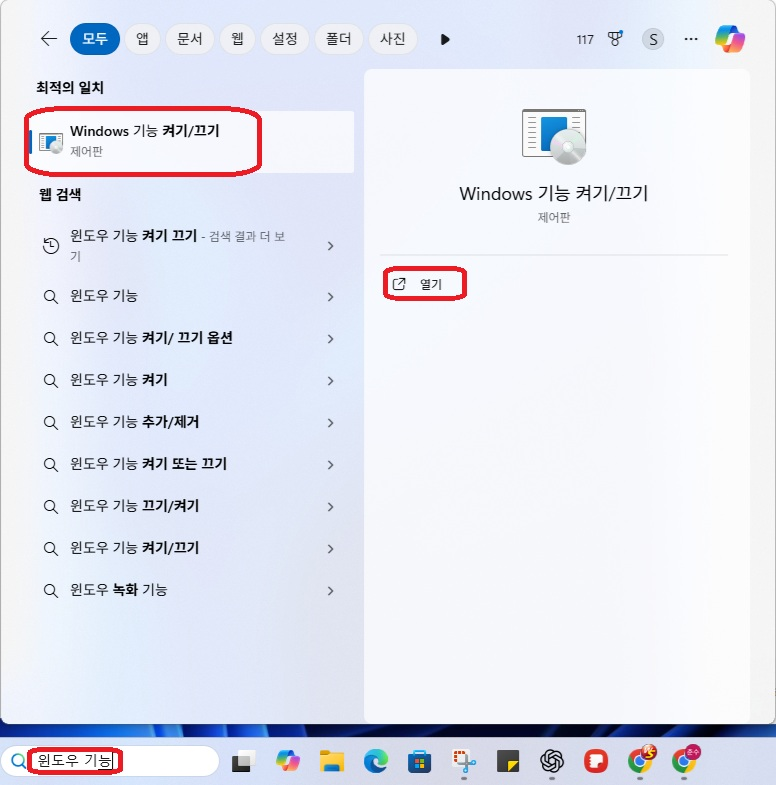 1. 시작 → 검색에 "윈도우 기능" 후 열기를 한다.