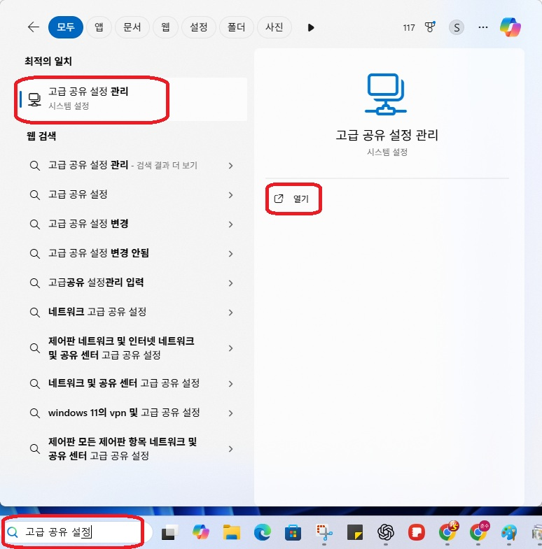 1. 시작 → 검색에 "고급 공유 설정" 후 열기를 한다.