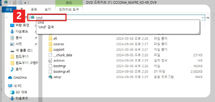 4. 아래 그림과 같이 탐색기 창이 열린다. 1번 부분을 클릭하여 CMD를 입력한다.