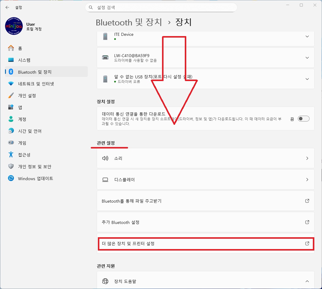2. 아래로 내려 관련설정더 많은 장치 및 프린터 설정을 클릭한다.