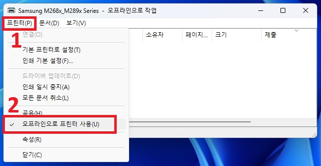 4. 창이 뜨면 프린터(P) 메뉴를 클릭하여 오프라인으로 프린터 사용(U)를 클릭한다.