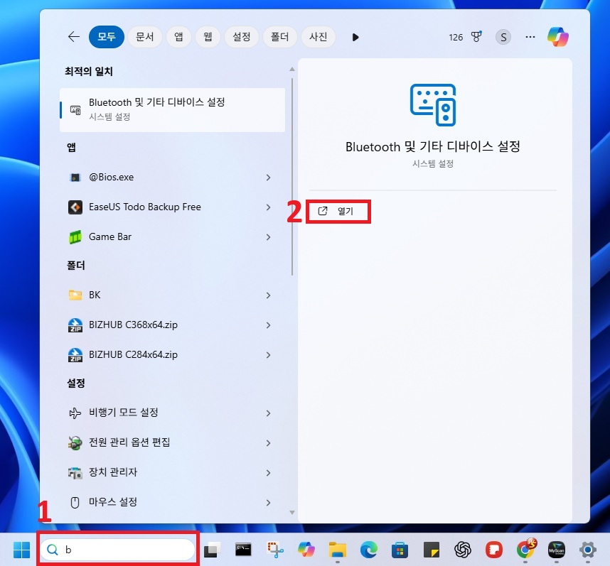 1. 작업표시줄 검색에서 "Bluetooth"를 검색하여 열기를 클릭한다.